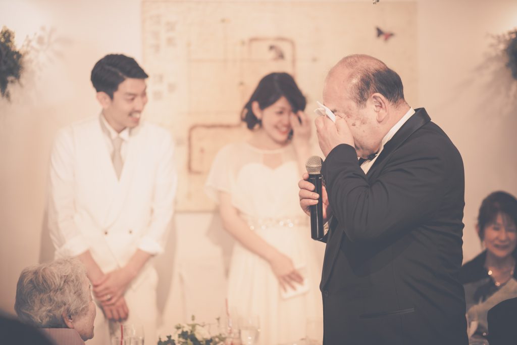 一新郎のお父様が行う挨拶「両家謝辞」や、新郎の挨拶をパーティのスタート時に行ってしまうのもおススメです。一般的にはパーティの最後に行う場合が多いですが、その場合、挨拶をする方はずっと緊張をしていなければなりませんし、パーティをなかなか楽しめないことも考えられます。