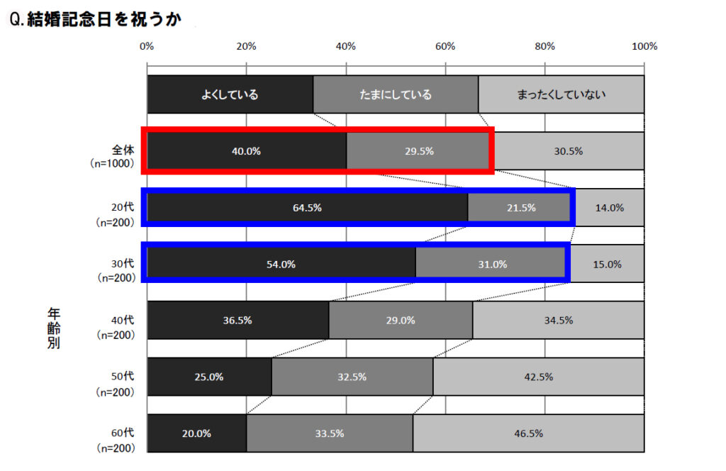 この調査は、20~60代までの夫婦1,000組を対象に行ったアンケート調査の結果です。まず、グラフの赤枠部分、全年齢のデータを見ていくと、約7割の夫婦が、結婚記念日のお祝いを「よくしている」、「たまにしている」と回答していました。