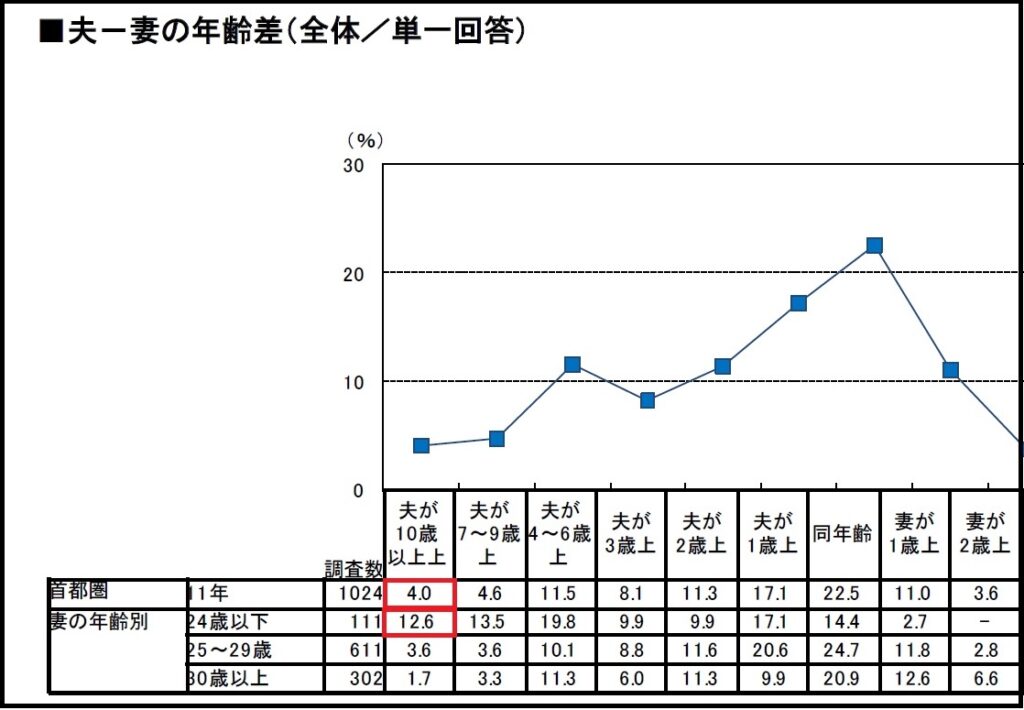 アンケートに回答した1,024組中のうち、年の差婚(10才以上の差)をしたのは4%という結果でした。この数だけをを見ると、たった4%かと思うかもしれませんが、女性側が「24才以下だった場合」に限定してみると、12.6%。つまり、8組に1組が年の差婚をしているということになります!