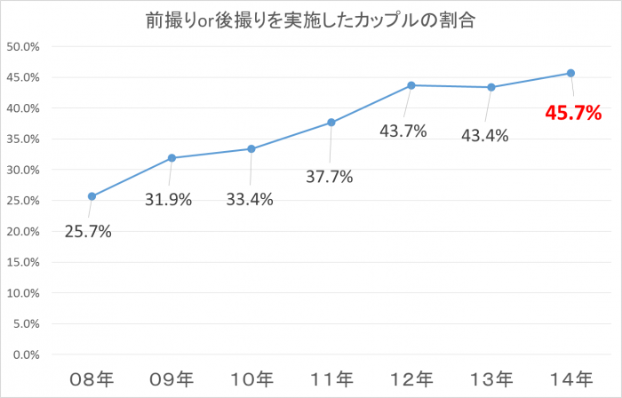 データの通り、前撮り・後撮り(結婚式の後日に写真撮りを行うこと)は年々実施率が高まっています。