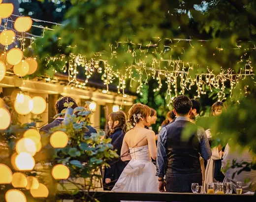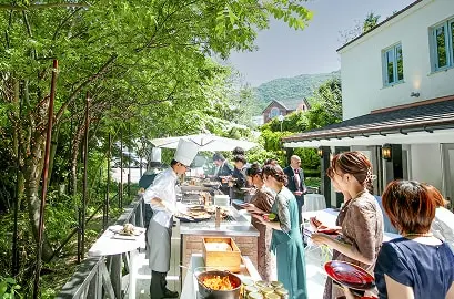 ガーデンテラスで心地よい風を感じながら。緑あふれる昼は陽光に包まれて、夜は幻想的な雰囲気の中で行うバーベキューは、まるでマルシェに居るように楽しい時間に。