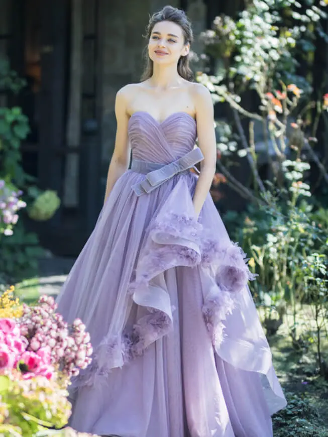 ごく淡い色をを幾重にも重ねたニュアンスのあるドレスはどこまでも優しく。